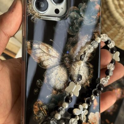 قاب موبایل آیفون پروانه ترنسپرنت مشکی پولکی طلایی