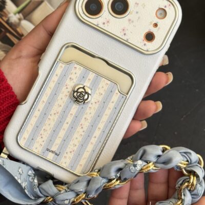 قاب موبایل آیفون گل فلاور کرم فندقی + بند چرمی ست