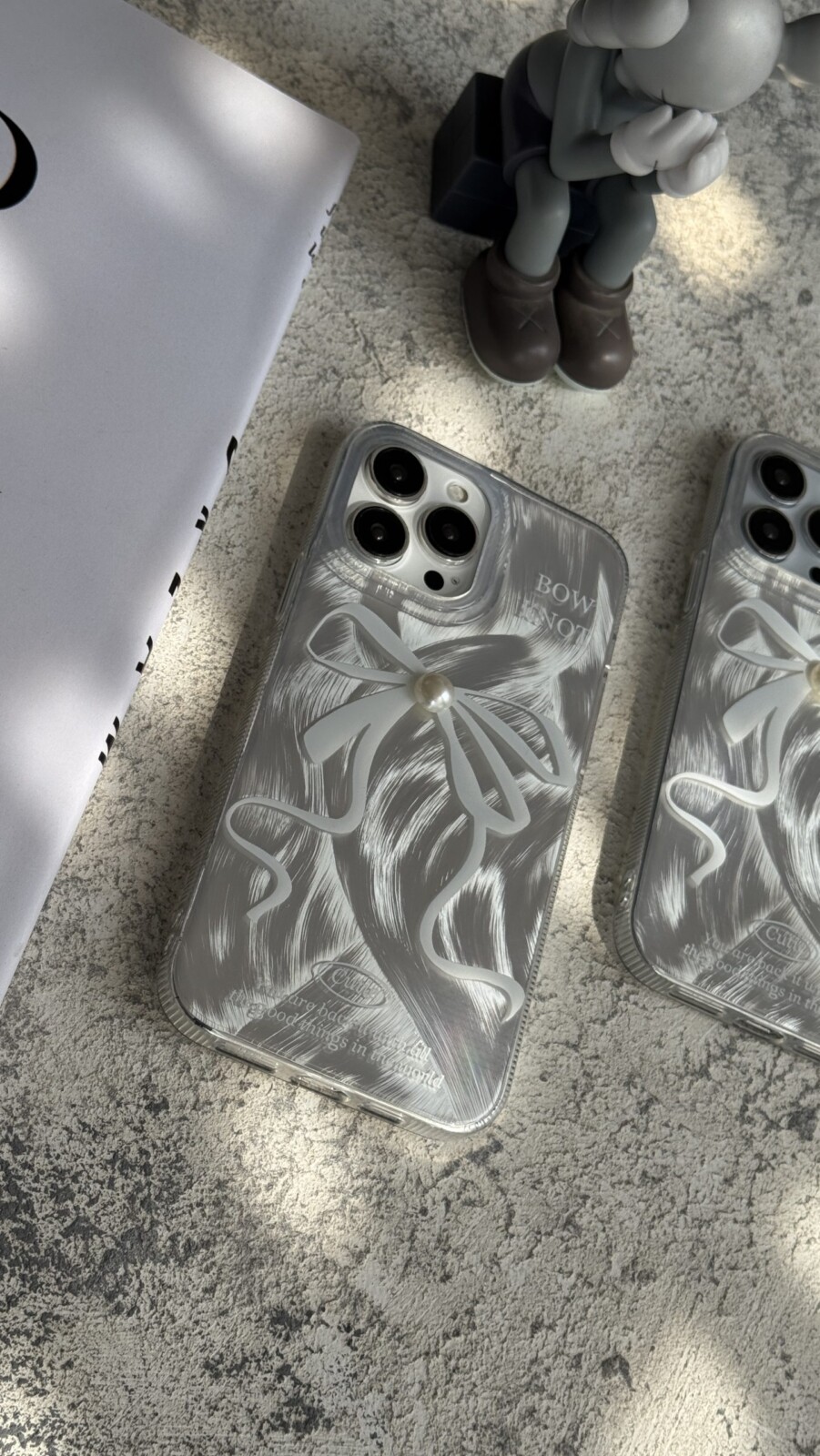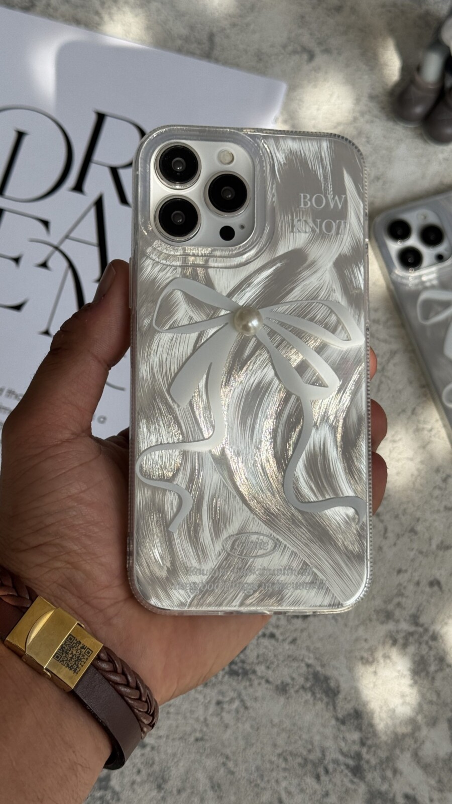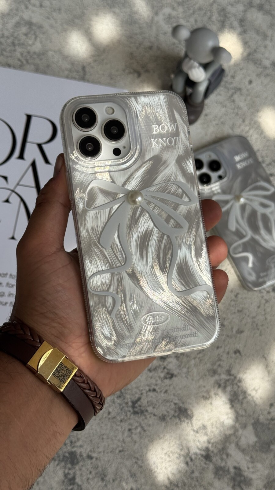 قاب موبایل آیفون بونات پاپیون شاینی نقره ای تک مروارید