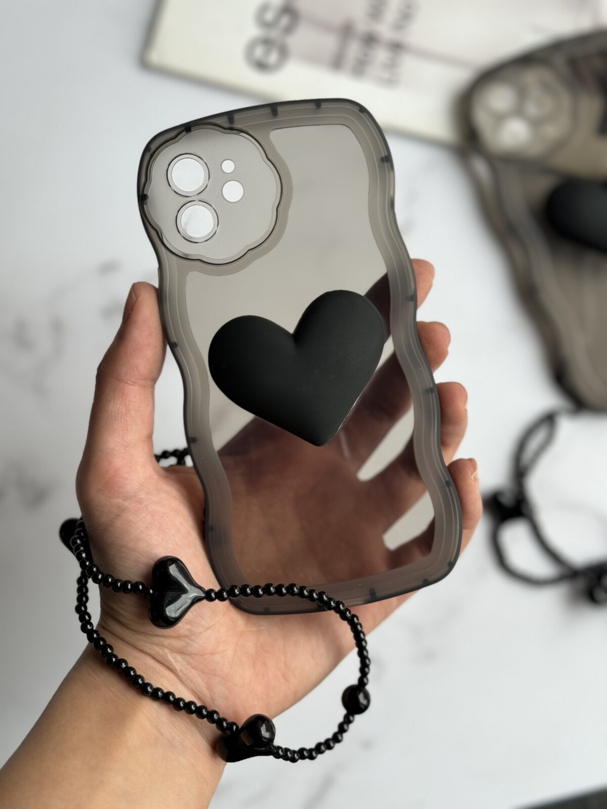 قاب موبایل آیفون تک قلب مشکی دودی + بندست قلبی ( 3004 )