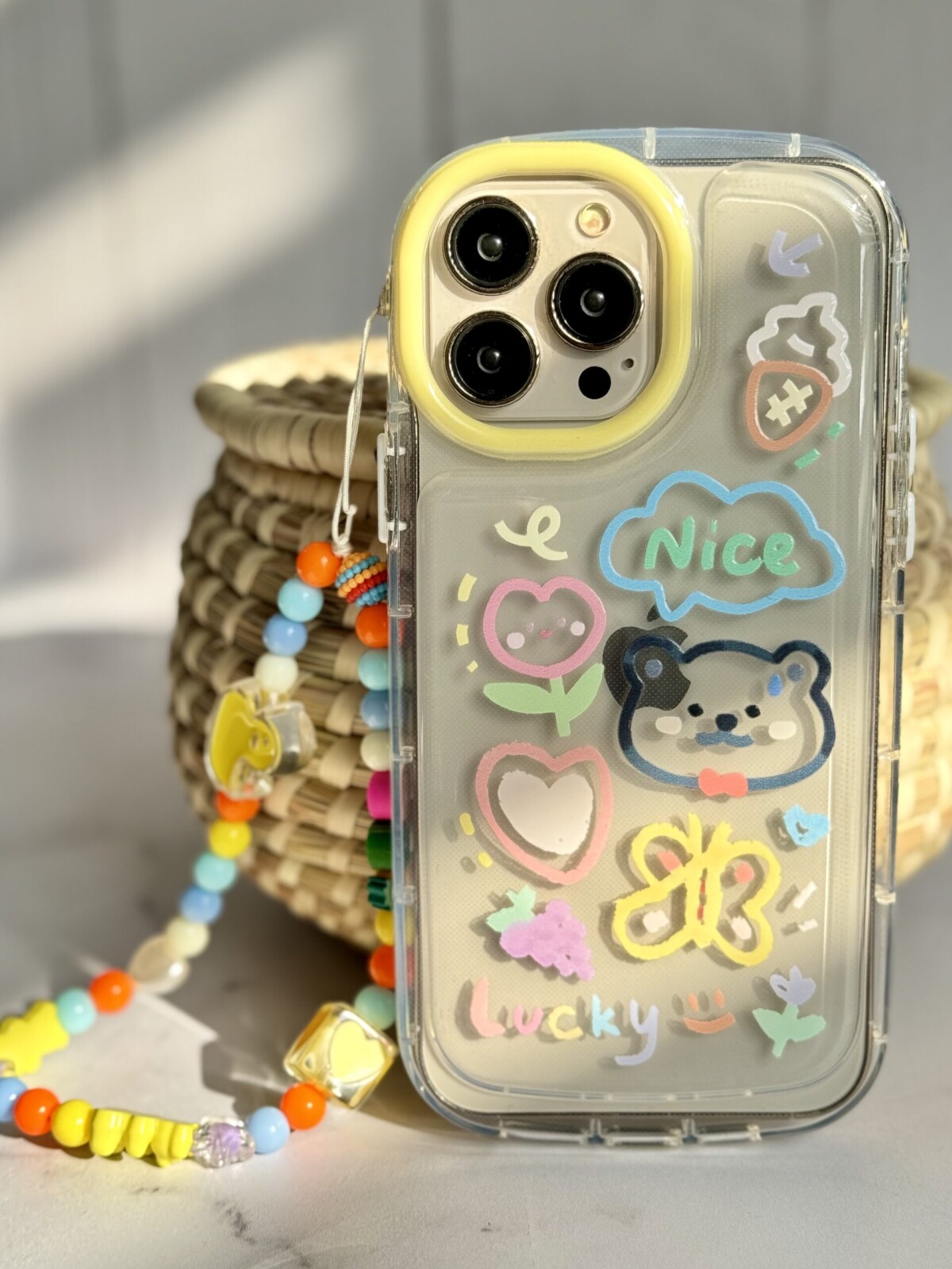 قاب موبایل آیفون خرس و پروانه نقاشی + بندست کوتاه
