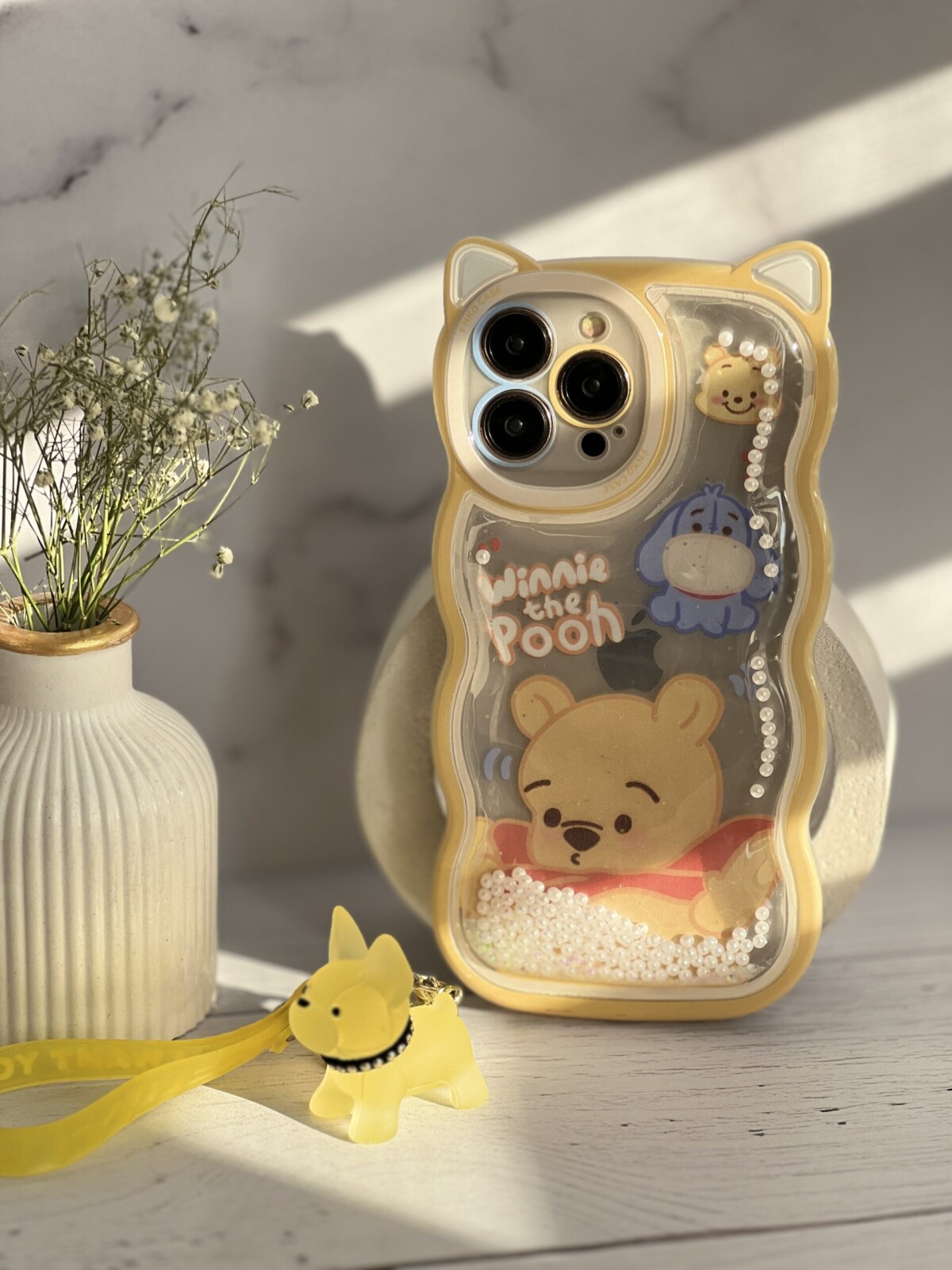 قاب موبایل آیفون خرس پو زرد آکواریومی مروارید دار گوش دار