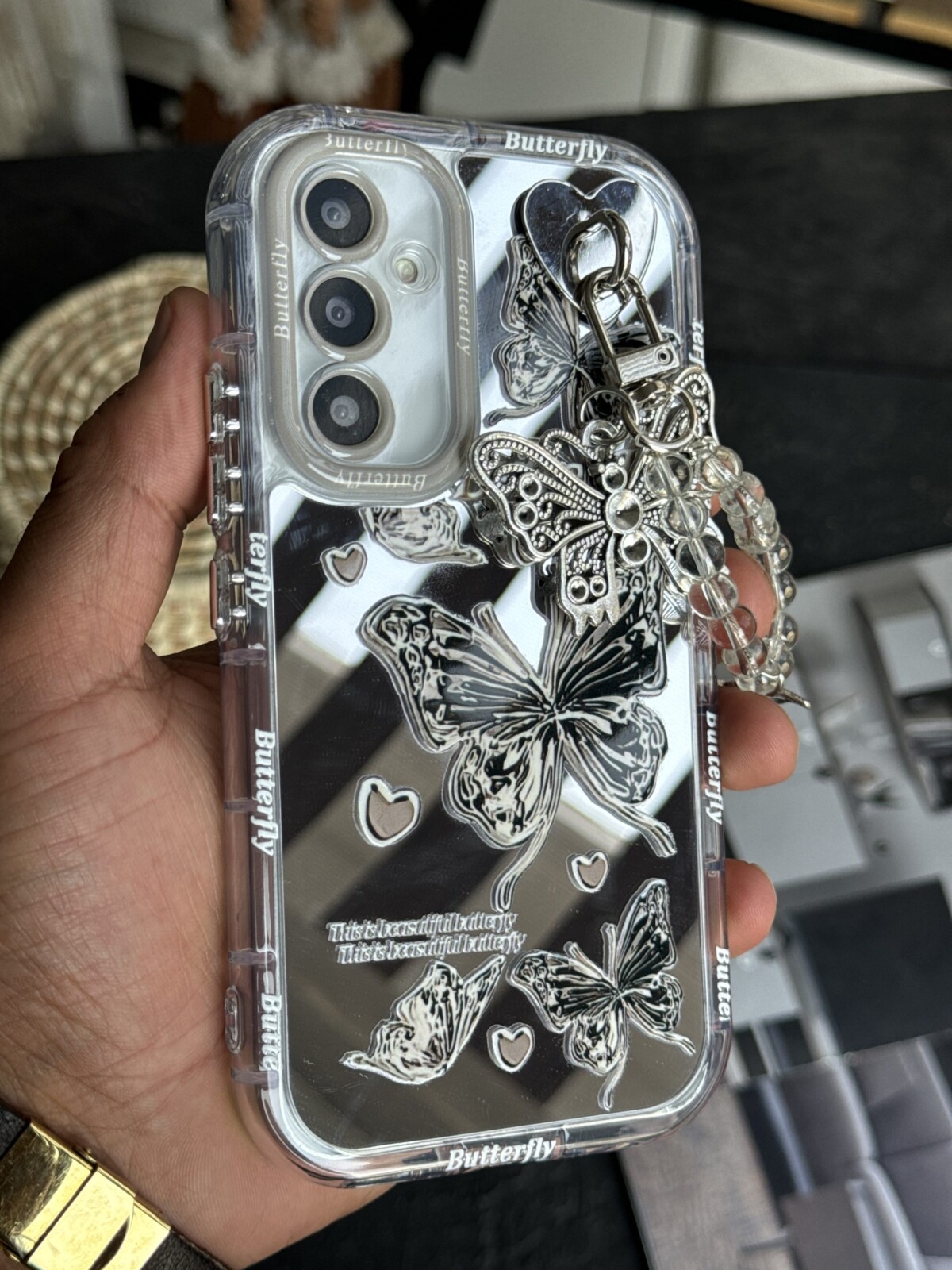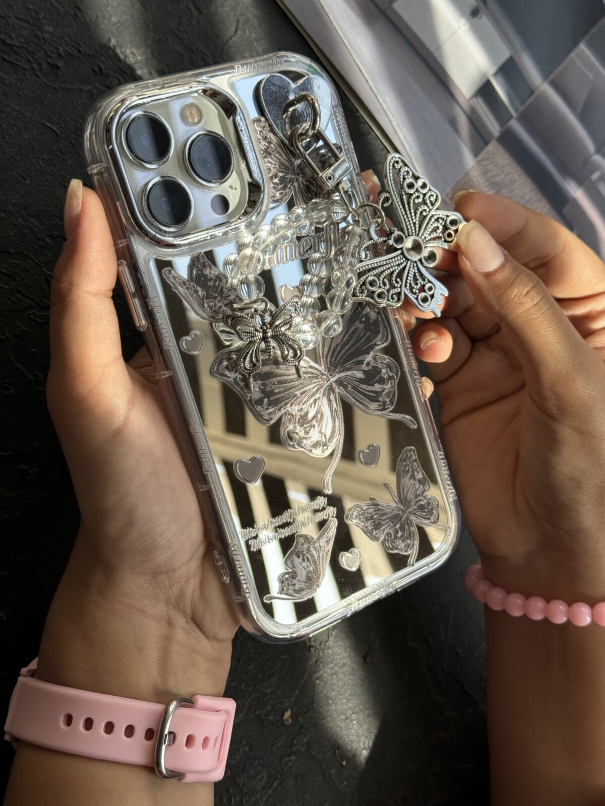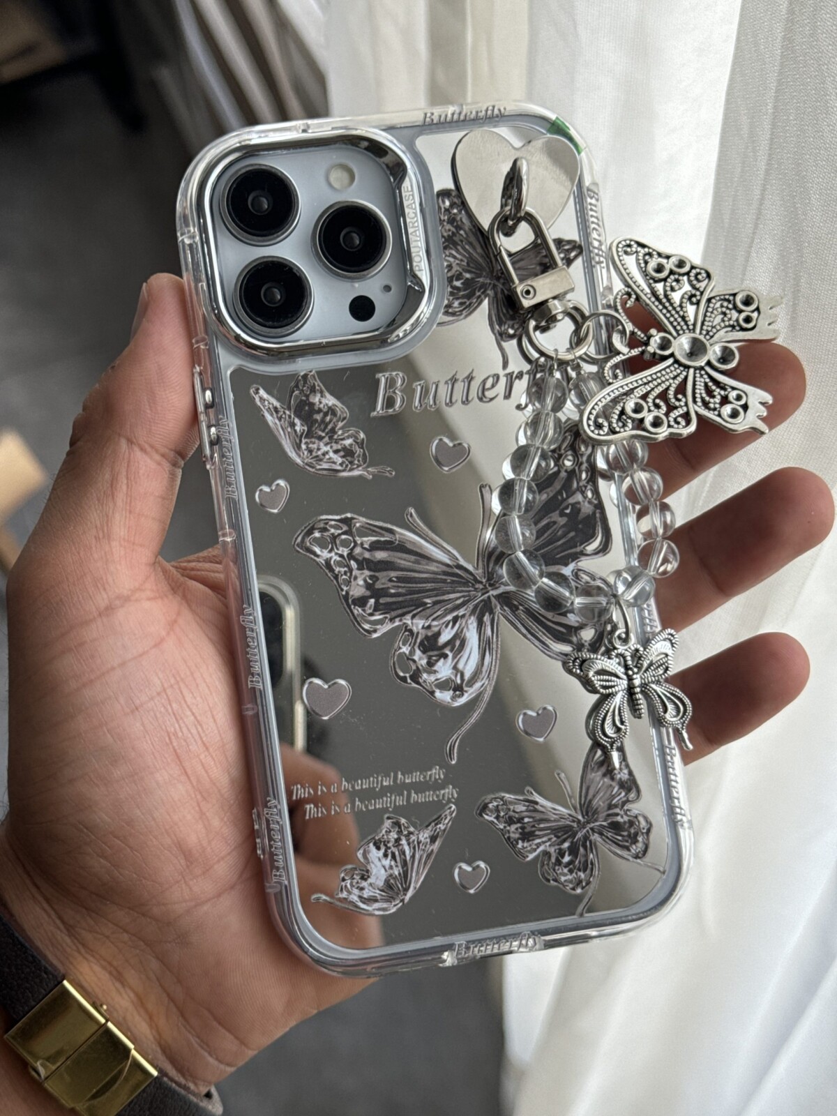 قاب موبایل ( آیفون – سامسونگ ) پروانه و قلب آیینه ای آویز دار