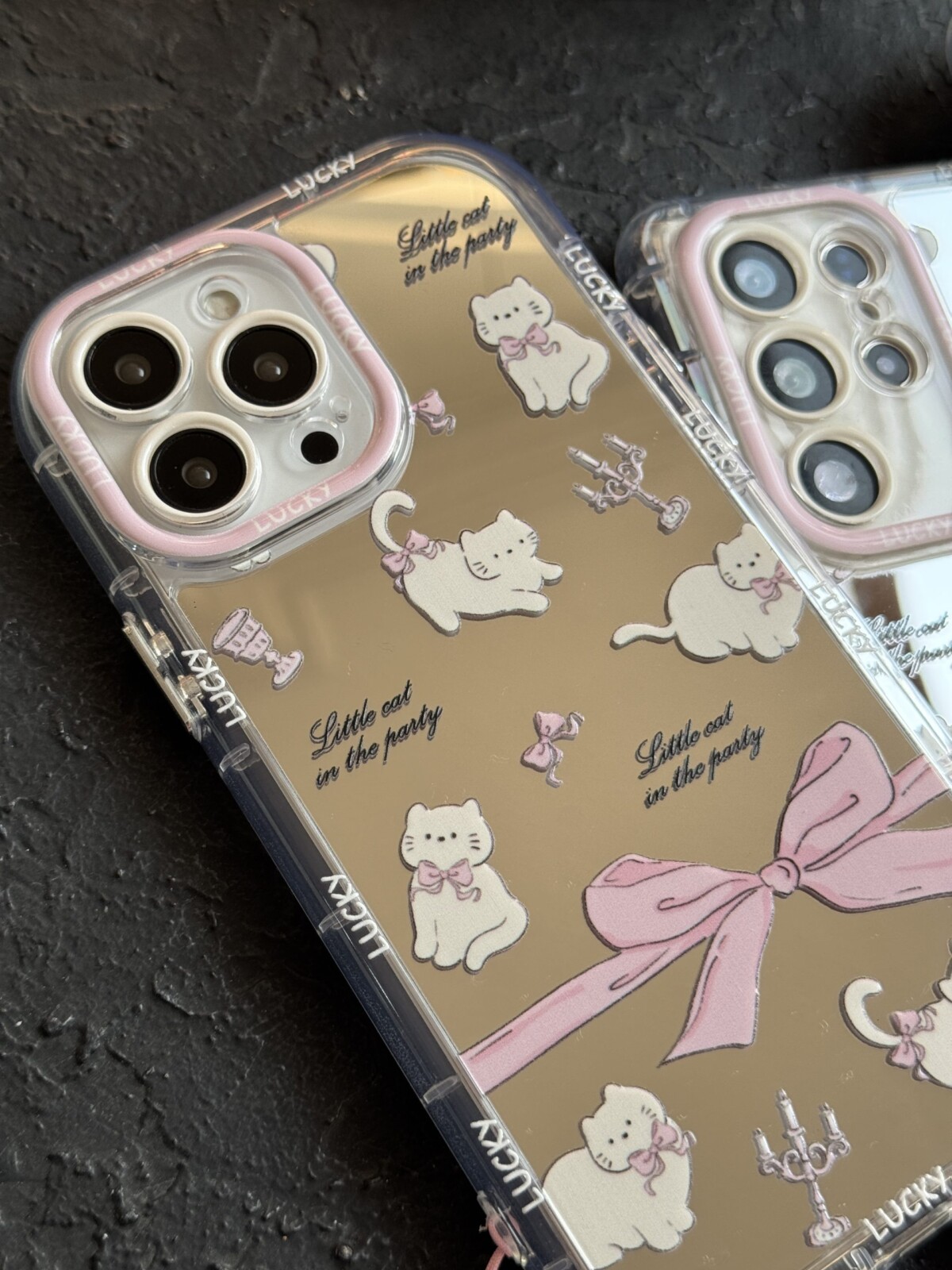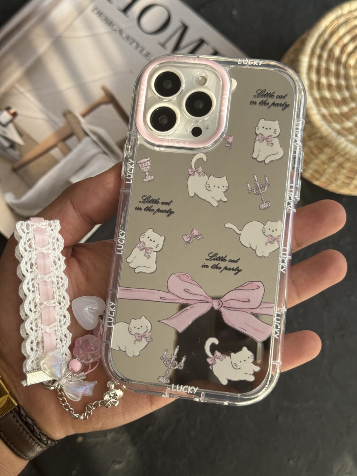 قاب موبایل ( آیفون – سامسونگ ) گربه پاپیون بزرگ آیینه ای صورتی + بندست
