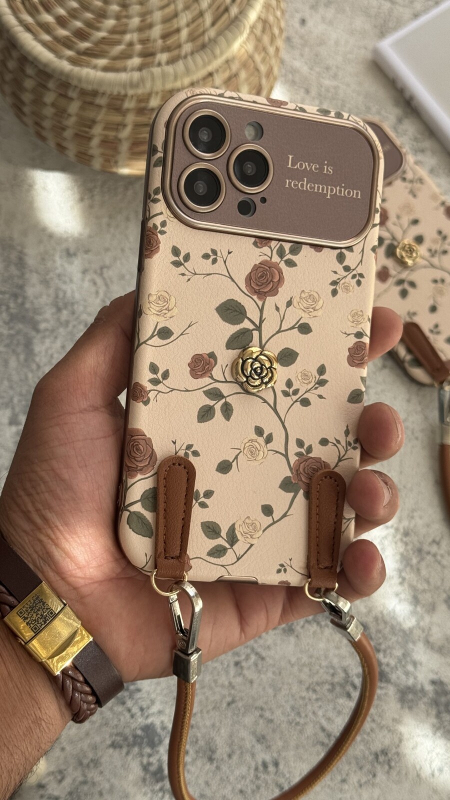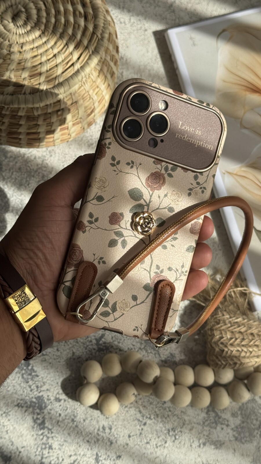 قاب موبایل ( آیفون ) گل رز فلورا قهوه ای + بندست چرمی