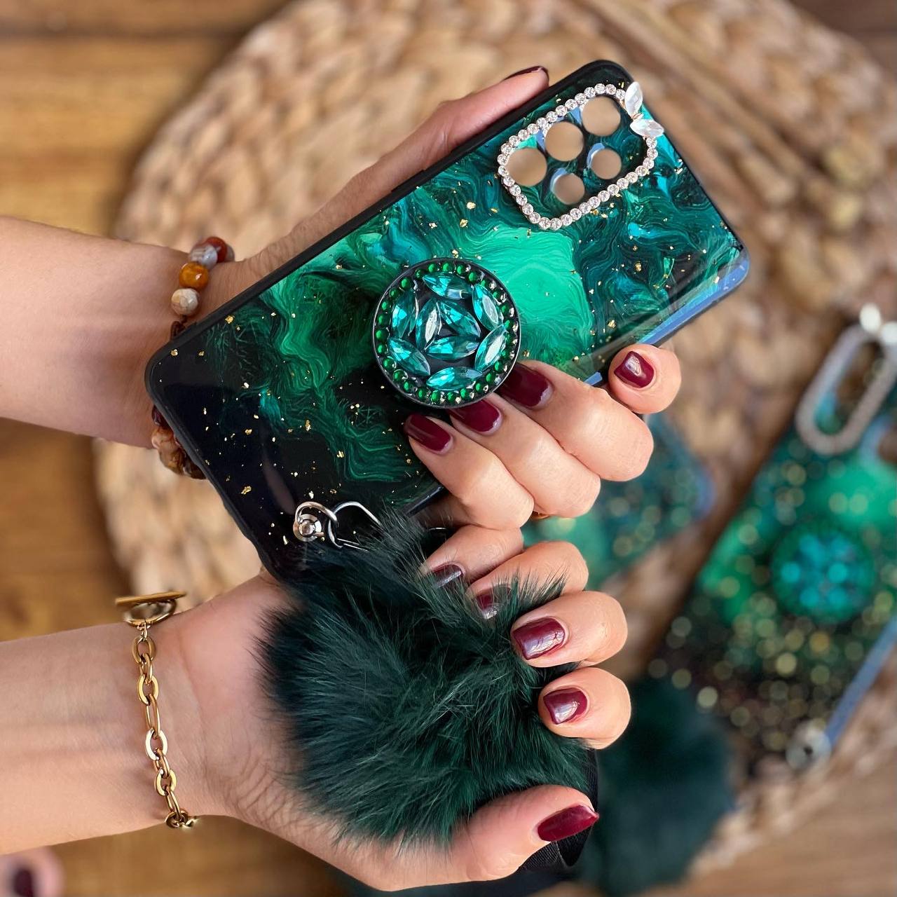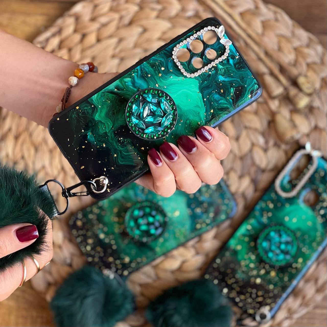 قاب موبایل سامسونگ ماربل پام پام یشمی نگین دار + پام پام + پاپ سوکت