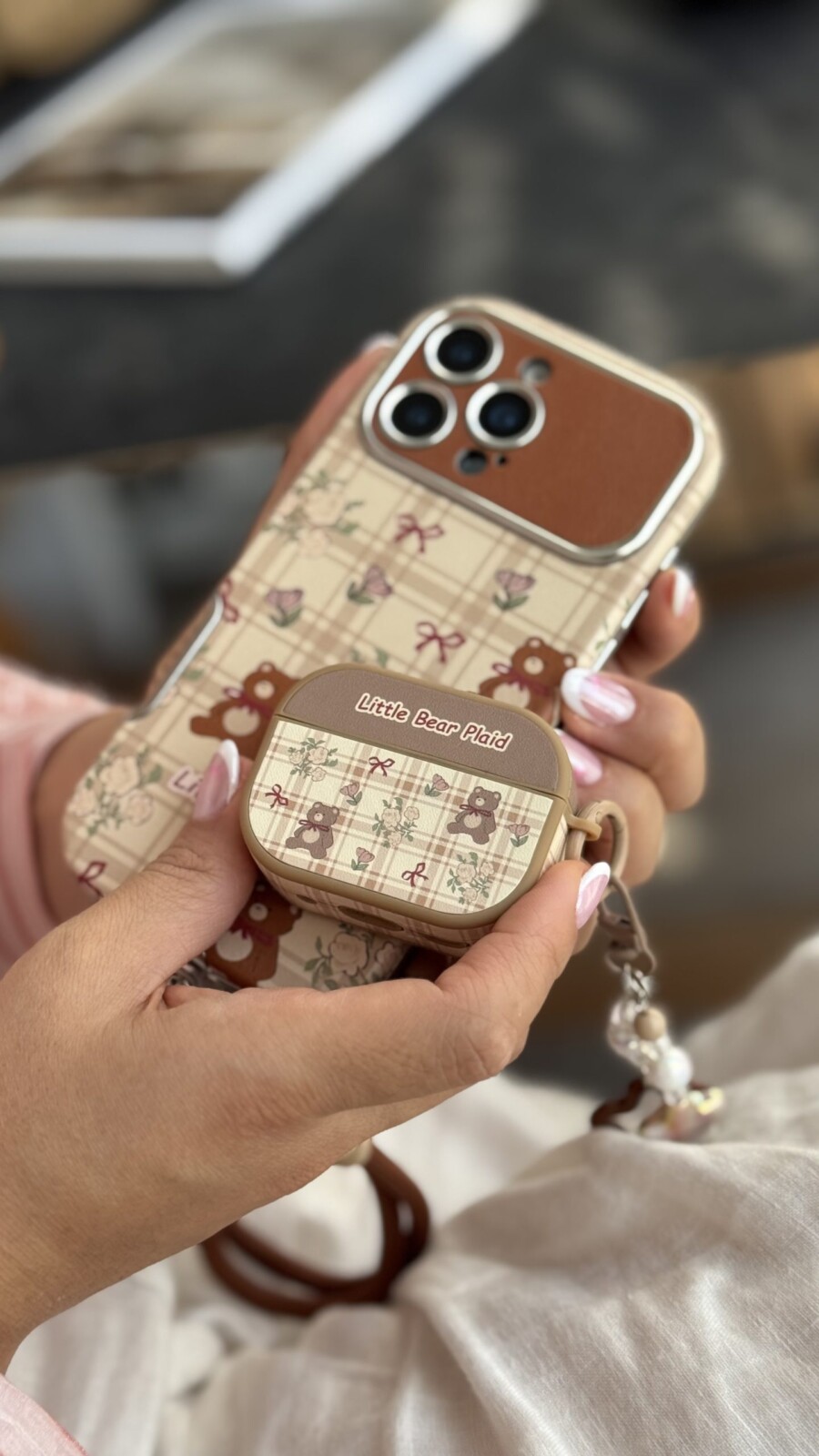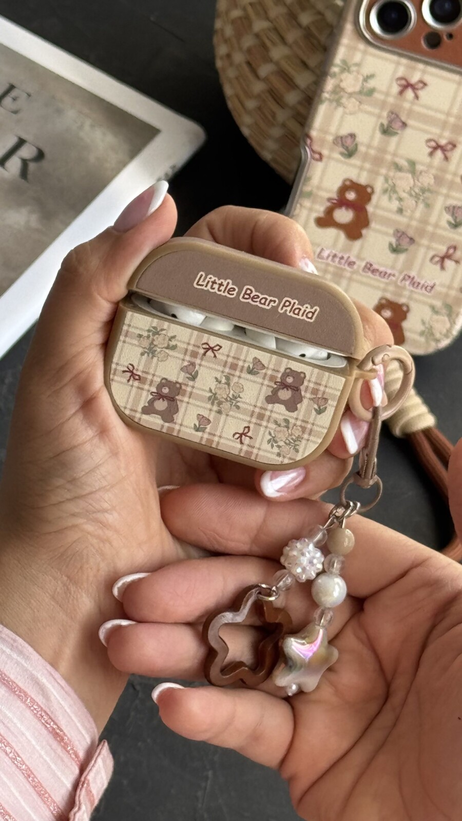 یکی از ویژگیهای برجسته این محصول، ترکیب زیبایی و کارایی است. طرح شطرنجی (Plaid) به همراه خرسهای کوچک و روبانهای قرمز روی کاور، یک استایل دخترانه و دلنشین ایجاد میکند. آویز ست موجود نیز شامل مهرهها و آویزهای ستارهای شکل است که جلوهای خاص به کاور میبخشد و آن را برای هدیه دادن نیز بسیار مناسب میکند.