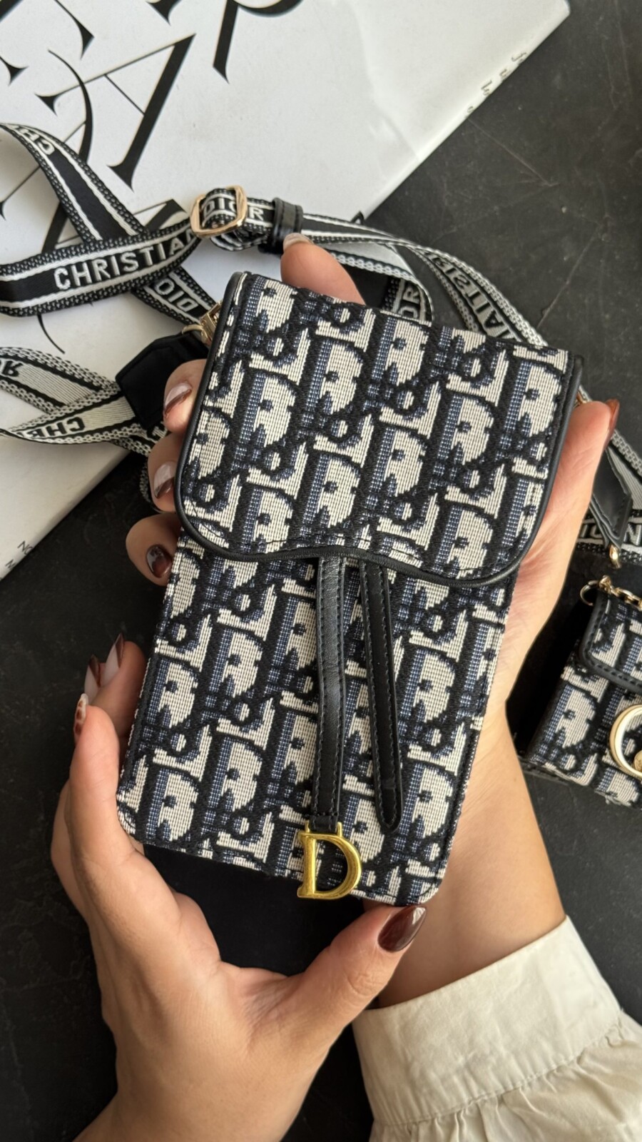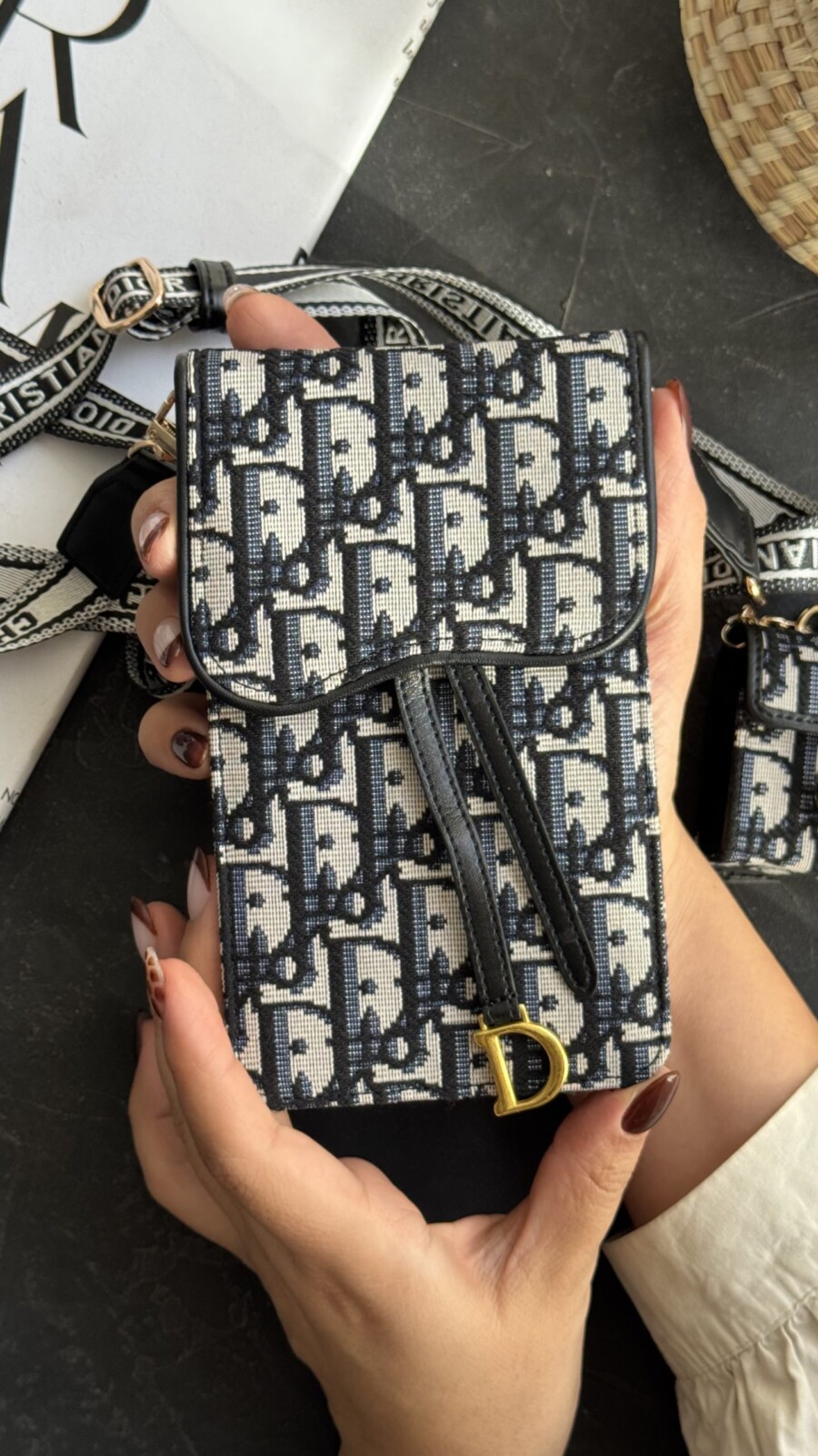 بند این کیف از جنس پارچه ضخیم با نوشتهی Dior طراحی شده است که علاوه بر زیبایی، دوام بسیار بالایی دارد. قابلیت تنظیم طول بند به شما امکان میدهد کیف را بهصورت دوشی، کراسبادی یا شانهای استفاده کنید.