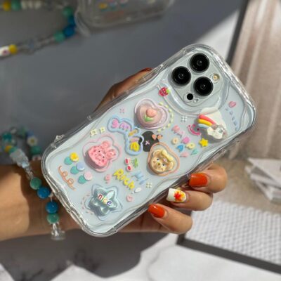 قاب موبایل آیفون اپوکسی بیرنگ روز شاد خرس و خرگوش برجسته + آویزست