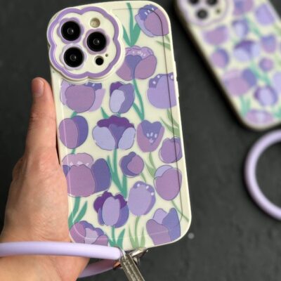 قاب موبایل آیفون گل لاله بنفش محافظ لنز طرح دار + حلقه ست ( 3011 )