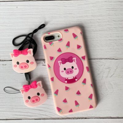 قاب موبایل آیفون خوک هندونه صورتی + پاپ سوکت و بند