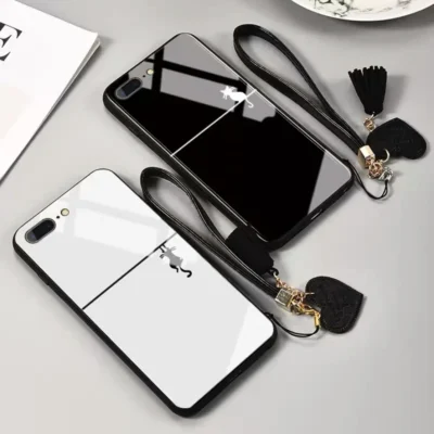 قاب موبایل آیفون گربه روی دیوار پشت گلس + بند ست