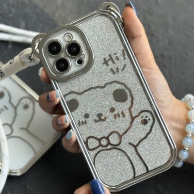 قاب موبایل سلام خرسی شاینی نقره ای + بند بلند آویز