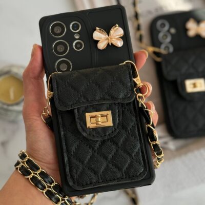 قاب موبایل سامسونگ مشکی بند زنجیری بلند بالشتی پروانه ای جاکارتی دار