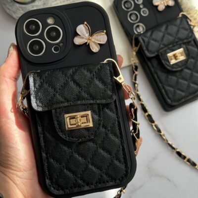قاب موبایل آیفون مشکی بند زنجیری بلند بالشتی پروانه ای جاکارتی دار