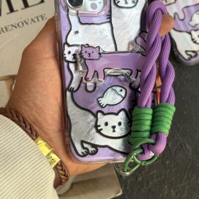 قاب موبایل آیفون گربه دراز سوسیسی بنفش پایه استندشو + بندست